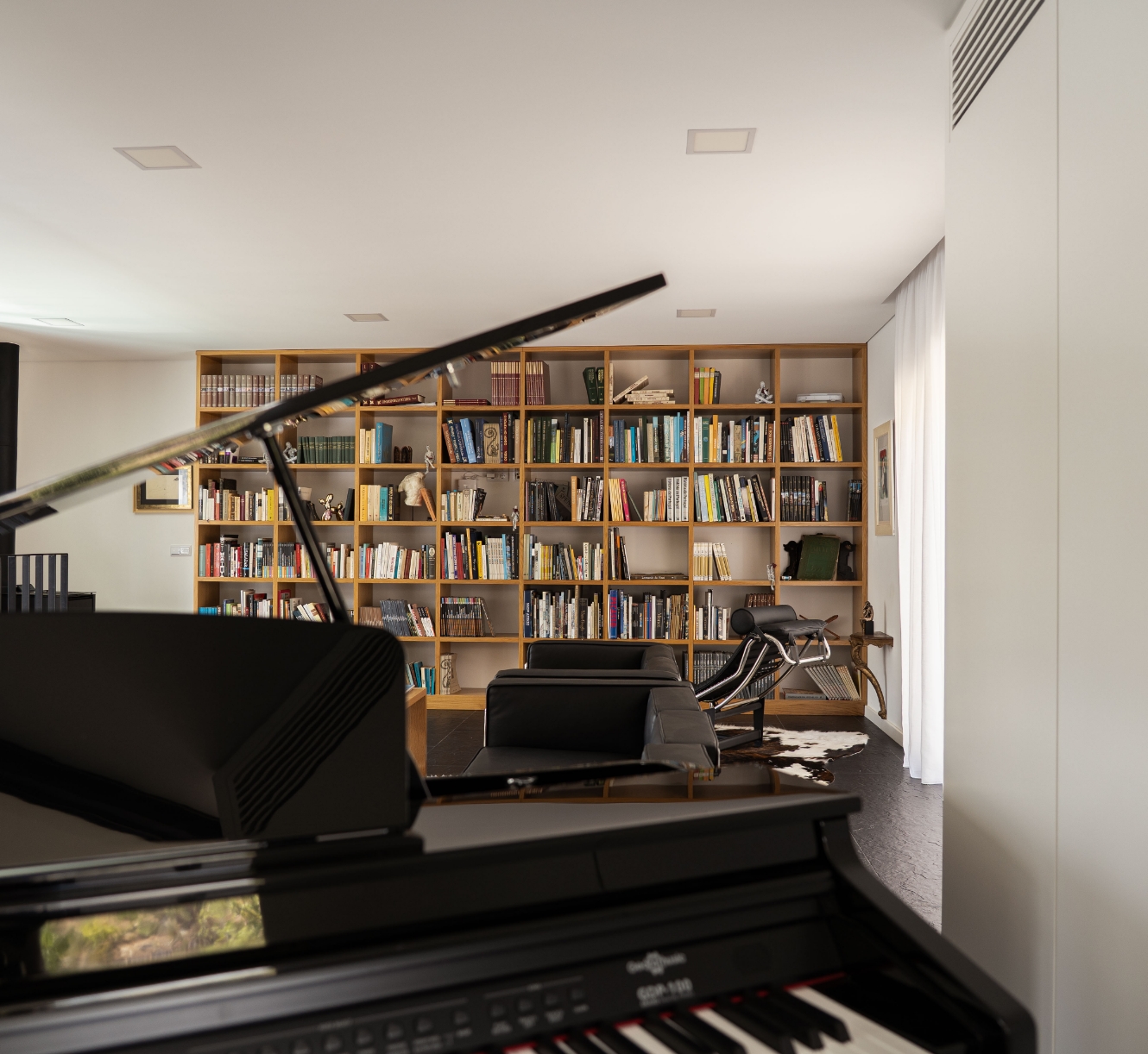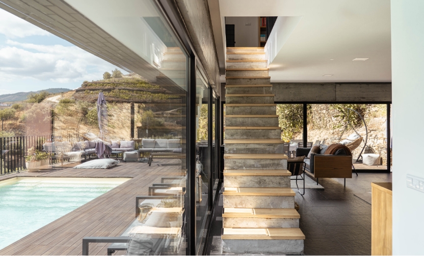 Nas áreas sociais da Casa do Ferrão o conforto e o bem-estar recebem atenção especial. No piso térreo, uma sala com acesso direto à piscina estabelece perfeita continuidade entre o interior e exterior. No piso superior, uma sala com biblioteca e piano convida à leitura e ao relaxamento. No exterior, a lareira transforma-se num recanto encantador, ideal para conversas, descanso ou simplesmente contemplar a paisagem envolvente.